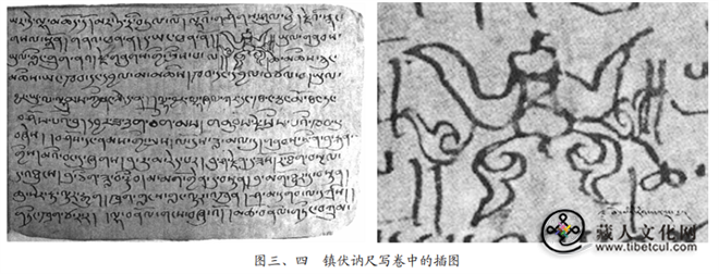 镇伏讷尺的写卷中有一幅恶鬼肖像插图,这种形象在后期藏文文献中被称为“灵噶(ལིངྒ)” 。该图像位于写卷第27页第2行至第3行左侧。图中恶鬼头部束有顶髻,面部呈圆形,双臂高举,双腿叉开,身上似乎缠绕着绳索(图三、四)。类似的图像在都兰县考肖图遗址(图五)和青海宗日遗址出土的兽骨上亦有所见。此外,察秀塘遗址出土的马头骨(03QZCXTJ2:16)上残留有墨绘的两道圆弧,圆弧内外及其间均绘有古藏文,且隐约可见其他图案的残迹,推测可能为类似的恶鬼图像。